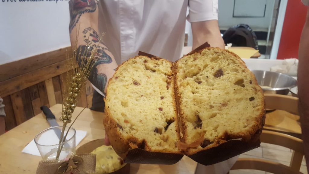 “Il nostro panettone è la storia della mia formazione, ho cominciato a fare i panettoni 14 anni fa. L’industria li produce mesi prima, durante l’ estate, e tende a mettere negli impasti degli emulsionati aggiunti. L’artigiano inizia a fine novembre e, per fare il panettone, usa aromi naturali” ci spiega l’esperto lievitista Fabrizio Franco.