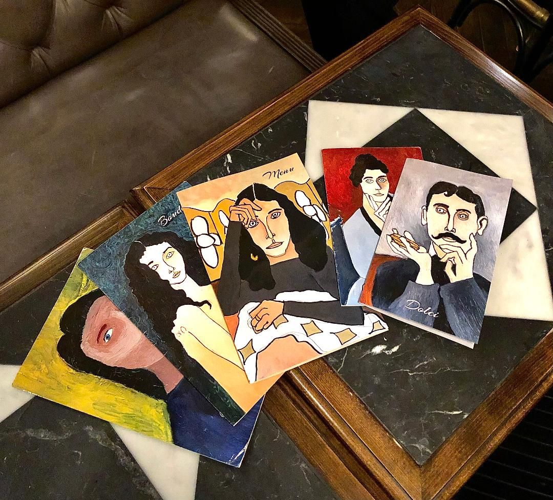 E così, Marcel Proust che sorregge una piccola madeleine non può che riferirsi al menu della pasticceria; l’uomo che campeggia sulla carta dei vini ricorda le sembianze di Bacco; l’atteggiamento riflessivo della donna su sfondo rosso riporta alla piacevole attesa in sala da tè e caffetteria; il verde ottanio su cui si staglia un’altra figura femminile rimanda alle atmosfere dark dei boudoir anni ’20; e infine i colori della memoria, come quelli dell’ultimo dipinto che hanno richiamato alla mente di Giancarlo Battafarano le tinte della cucina di sua nonna e che, per questo, si sposano con il menu del pranzo e della cena.