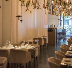Spazi contenuti (38 coperti incuso il soppalco) con la possibilità di pasteggiare al bancone del bar (4 coperti) o di fronte alla cucina a vista (4 coperti), ambienti volutamente scuri, ma illuminati e resi accoglienti dalle sapienti lampade da tavolo Tetatet di Davide Groppi, capaci di esaltare le pietanze e le raffinate stoviglie di Serax che le accolgono.