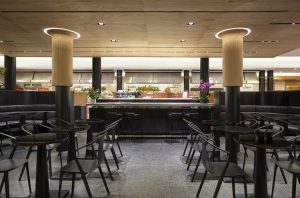 Disegnato dall’architetto Alessandro Scandurra (già autore degli Expo Gate) nei toni cioccolato e miele, con le sedie Belville di Vitra, le colonne neoclassiche e il bancone in legno dai riflessi in vetro scuro e zinco, ripropone in chiave contemporanea l’atmosfera dei caffè viennesi anni’30, chiaro riferimento alle origini della bottega nata nel lontano1883. Uno spazio così ben inserito nella struttura precedente, che sembra essere esistito da sempre