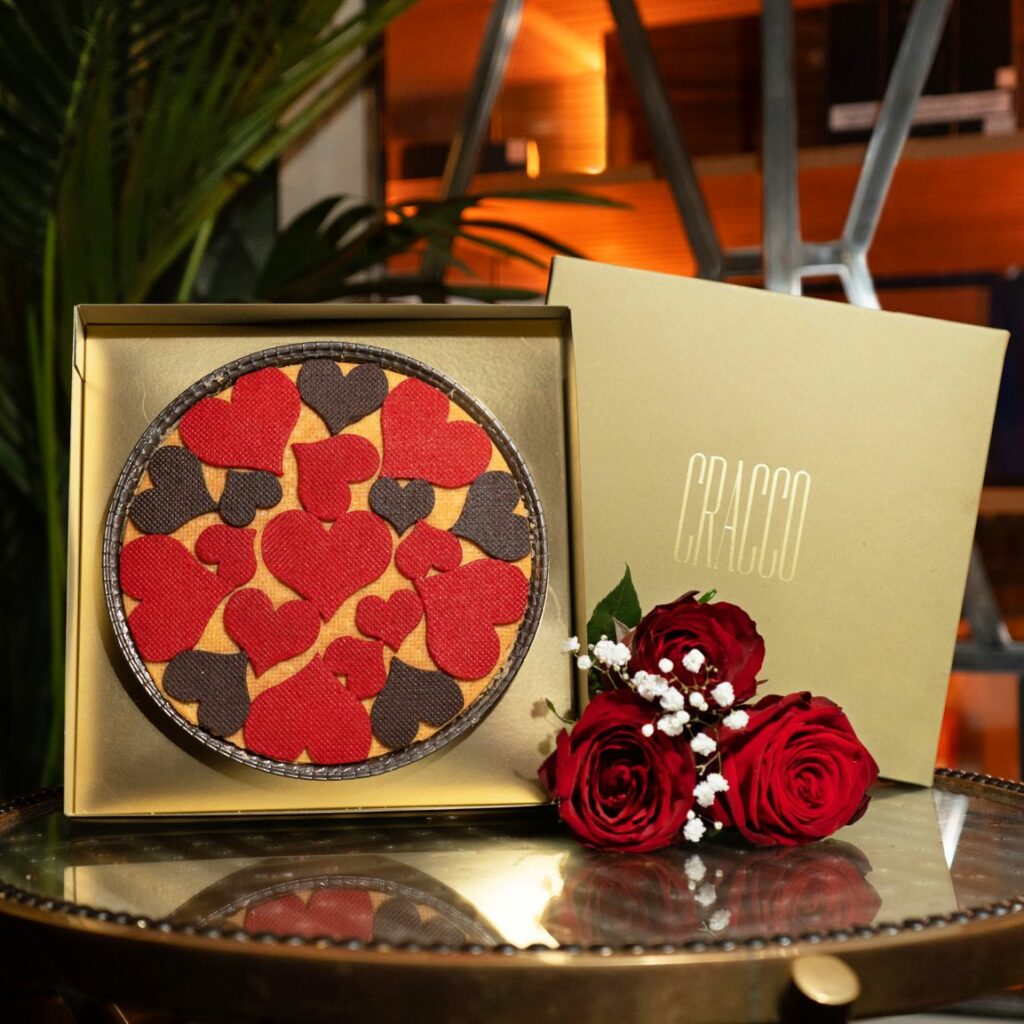 Quest’anno accanto alle immancabili praline assortite e forma di cuore e alla rosa in vaso realizzata interamente in cioccolato e totalmente commestibile, vaso compreso, una novità: una bottiglia di profumo a forma di cuore. Questa creazione è un dolce per due persone, composto da strati di pan di Spagna e ganache realizzate con diverse monorigini di cioccolato, decorato con foglia oro da gustare insieme.