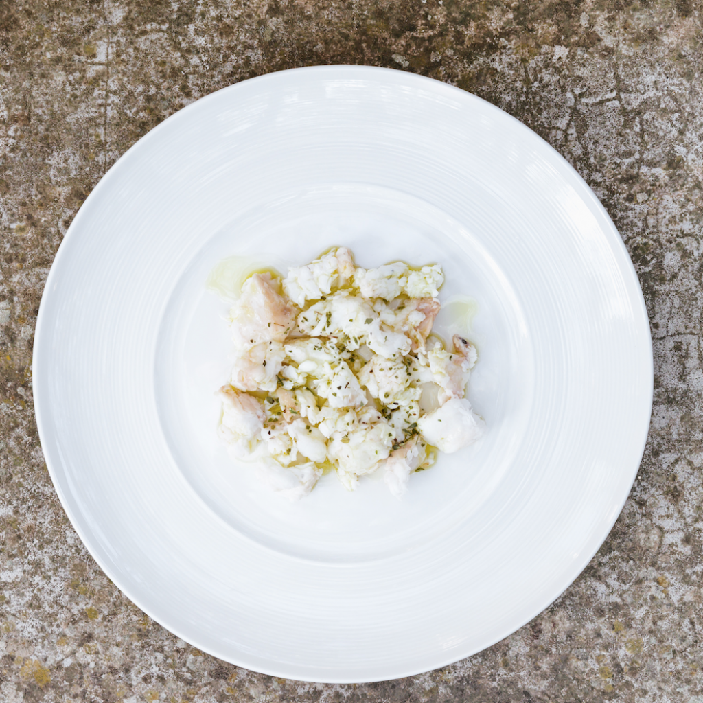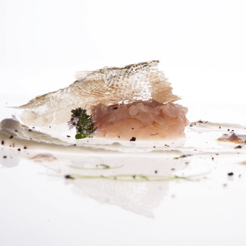 Sfilettate il pesce, abbatterlo per almeno 24h a -21°C, tenendo da parte la pelle. Quest’ultima deve essere pulita bene dalla polpa, condita da pochissimo sale e adagiata su carta forno o silpat in teglia. Copritela con un altro foglio di carta forno mettendoci una teglia della stessa dimensione con un peso cucinandola a 150°C per mezz’ora circa; dovranno risultare croccanti e trasparenti. Per il gel, porre in un sacchetto sottovuoto le mele, lavarle accuratamente e tagliarle a pezzi assieme a zucchero, acqua e acido citrico. Chiudere e cuocere in acqua a bollore per 1h circa e poi filtrate l’acqua senza pressare la polpa. Al succo ottenuto e raffreddato, se necessario, aggiungere della xantana. Prendere la robiola tenuta a temperatura ambiente, metterla in una ciotola e con una frustina montarla; dovrà risultare quasi spumosa.