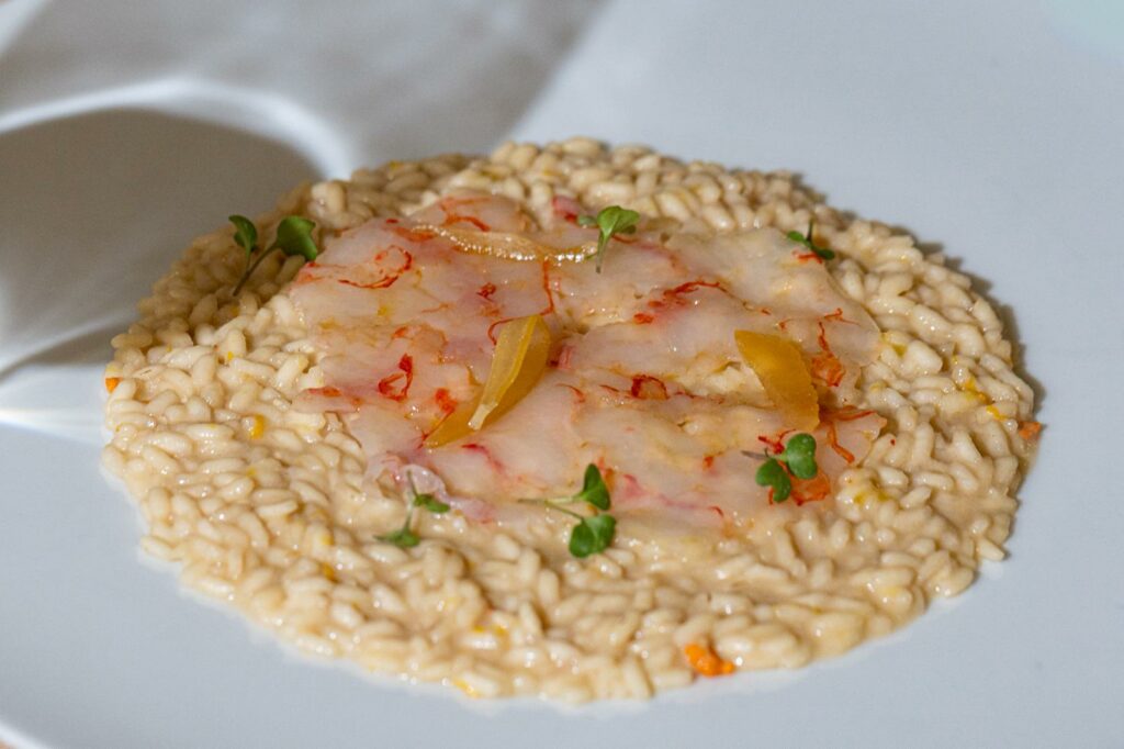 Risotto Acquerello con carpaccio di scampo, burro agli agrumi e limone fermentato