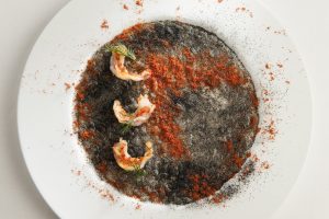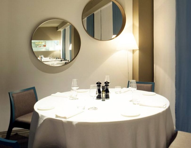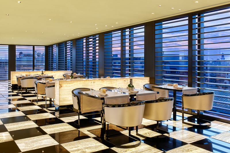Essenzialità in bianco e nero, inserti in onice retroilluminati e vista panoramica sulla città. L’Armani Hotel di Milano offre un menù degustazione che comprende: Ricciola, Kombu, pomodoro affumicato, crema di latte, caviale siberian royal; uovo a 65 gradi con Topinambur, quinoa soffiata, yogurt essicato, terriccio amaro; Tortelli di scampi, limone, burrata e limone; Petto d’anatra, kumquat, rape bianche, spezie; Lampone, Caramello salato, gelato alla rosa