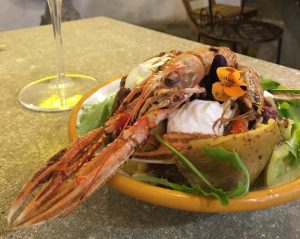 Morbido di vitella rosolato alle erbe e gambero rosso servito crudo con la sua bisque, crema di patate viola