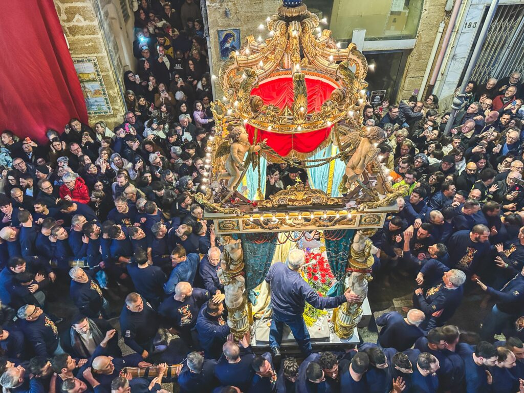 Una processione intensa e profondamente partecipata attraversa il centro storico, richiamando migliaia di fedeli provenienti da Sciacca, dai comuni limitrofi e numerosi emigrati rientrati dall’estero, in particolare dagli Stati Uniti, per prendere parte a uno degli appuntamenti più identitari della comunità saccense. Il momento culminante delle celebrazioni si svolge nel pomeriggio, quando oltre cento pescatori, come vuole la tradizione, portano a spalla e a piedi scalzi la statua in marmo bianco di Carrara di Maria Santissima del Soccorso, opera degli scultori Giuliano Mancino e Bartolomeo Birrittaro, giunta a Sciacca via mare nel 1503.