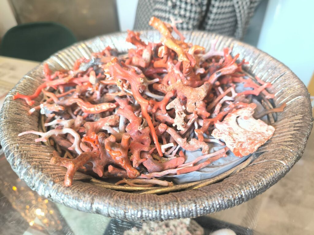 Il corallo rappresenta il vero fiore all’occhiello di Sciacca. Si tratta di una varietà di eccezionale valore, rinomato per le sue tonalità uniche che variano dall’arancio intenso al salmone-rosa pallido, spesso caratterizzato da macchie brunastre o nere. Scoperto alla fine del XIX secolo nei banchi vulcanici di fronte a Sciacca si distingue per la sua natura sub-fossile, formatasi a causa di antiche eruzioni sottomarine, e per l’elevata durezza. Si presenta solitamente con rami affusolati e spessore medio di circa 7 mm. La lavorazione del corallo di Sciacca è una tradizione artigianale locale di grande pregio, che trasforma questa gemma in monili, amuleti e oggetti preziosi.