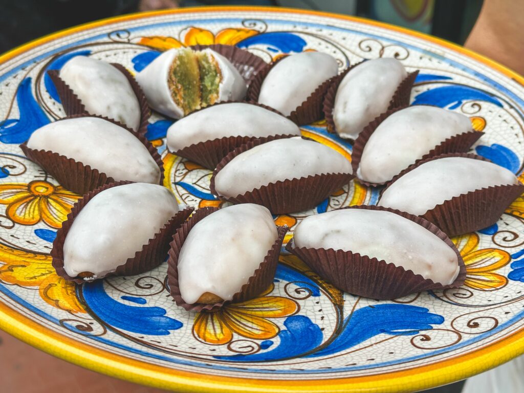 I Cucchiteddi (Il termine deriva dalla loro caratteristica forma, che ricorda quella del dorso di un cucchiaio) sono un antico e pregiato dolce tipico della tradizione conventuale di Sciacca. Si tratta di piccoli pasticcini di pasta di mandorla con un cuore di “zuccata” (confettura di zucca), il tutto ricoperto da una lucida glassa di zucchero.