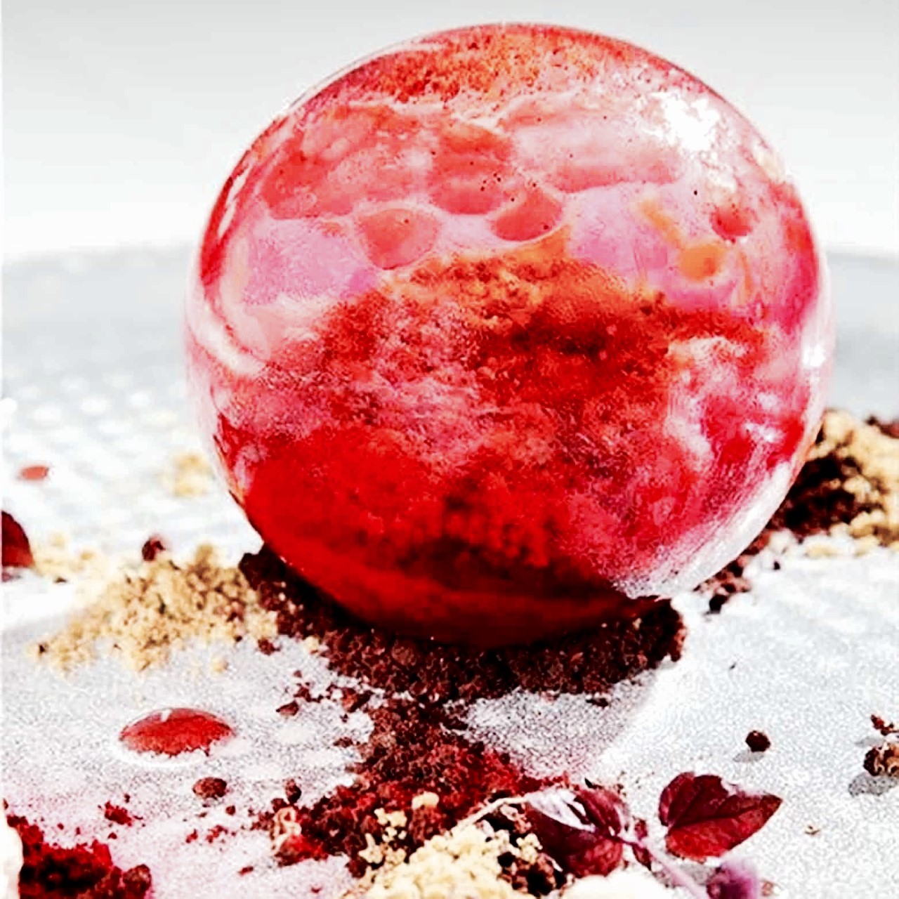 Portare lo zucchero a 170° aggiungendo a fine cottura il colorante e l’essenza. Versarlo su di un foglio di silpat, appena risulterà leggermente rappreso ed elastico, iniziarlo a lavorare con dei guanti termici fino a renderlo lucido. Lavorandolo sotto una lampada per lo zucchero, iniziare a formare delle sfere di circa 3 cm, dopodiché infilare l’apposita pompetta da zucchero all’interno della sfera e gonfiare gradualmente, facendo attenzione alla temperatura dello zucchero, ottenendo così le sfere che andranno poi riempite al momento di servirle.