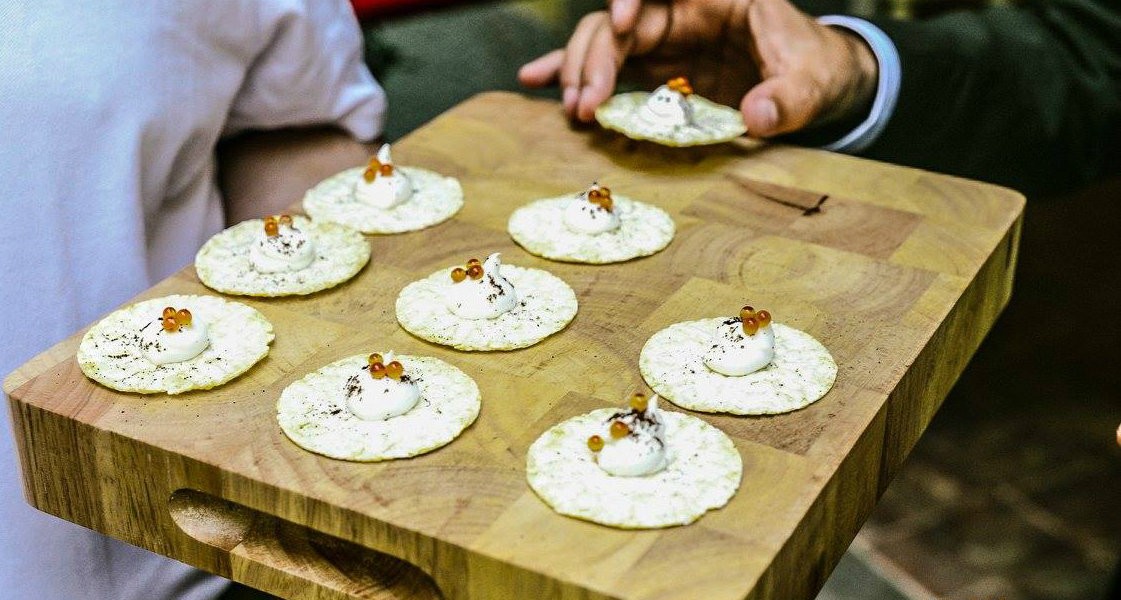 Per il menu aperitivo Davide Oldani ha rivisitato in chiave gourmet un ingrediente semplice come le cialde di riso, ottenute con una macchina che pressa il riso crudo con un po’ di zafferano e lo cuoce tramutandolo appunto in cialde molto croccanti. Ce ne sono di creative e più classiche. E sono gustose e leggere, proprio come vuole il concept Riso Scotti.