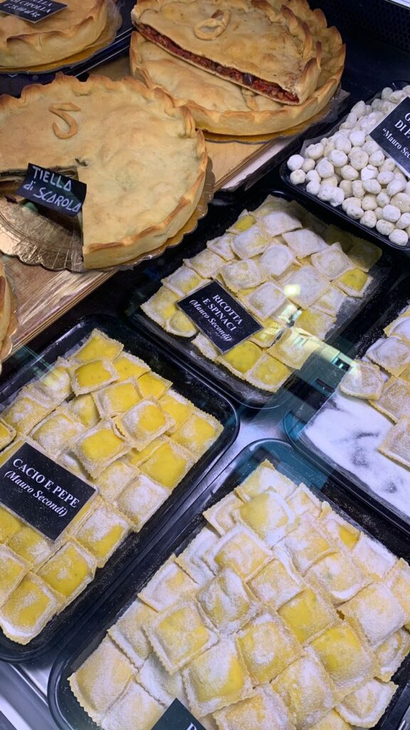 Le vetrine grandi fanno intravedere la quantità di prodotti che, escluse alcune scelte di comodo comprensibili, sono veramente di gran qualità. All’interno è presente un banco del pane che mette in bella mostra una pizza scrocchiarella che si finisce prima di arrivare a casa. Sugli scaffali anche una piccola selezione di verdure e paste secche tra le migliori in circolazione come Benedetto Cavalieri, Monograno Felicetti, Pastificio Mancini. Il banco gastronomico è lungo e ricco, latte Salvaderi consegnato il martedì, salmone selvatico, burro salato D’Insigny.