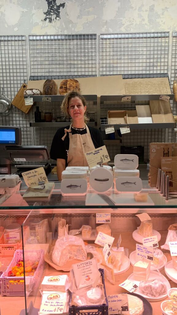 La spesa da lei si fa con piacere anche perché ti racconta personalmente e con l’entusiasmo e la calma di chi ama profondamente quello che fa la provenienza e la storia di tutti i prodotti che ha in vendita. Alla domanda “Quali sono i prodotti a cui sei più legata?” risponde con la franchezza del goloso per eccellenza “non mi lego a niente veramente, mi piace provare, assaggiare e proporre sempre cose nuove”.