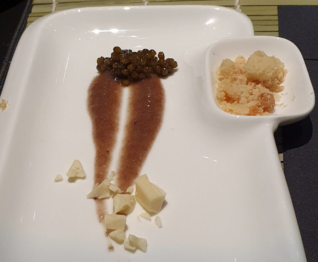 A chiudere il sipario sulla cena, due dolci inconsueti: la banana con cioccolato bianco, frolla salata e caviale, omaggio provocatorio alle donne per il suo non troppo velato rimando alle loro sinuose gambe, da mangiare tutto in un boccone. La dolcezza della banana e del cioccolato bianco fanno da contraltare alla sapidità del caviale e della frolla salata scatenando le papille gustative.