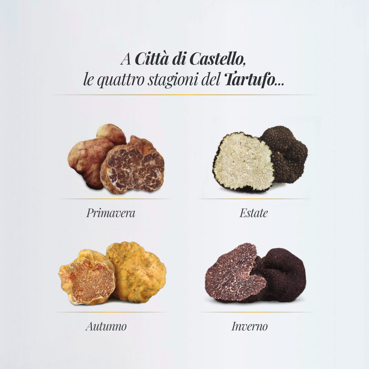 In queste terre infatti, accanto alla trifola, il celebre Tuber Magnatum Pico, protagonista della stagione autunnale, e quindi della Mostra, è possibile trovare il nero pregiato (Tuber melanosporum) durante l’inverno, il bianchetto, o marzuolo (Tuber borchii), in primavera e il nero estivo, o scorzone (Tuber aestivum), nel periodo più caldo dell’anno.