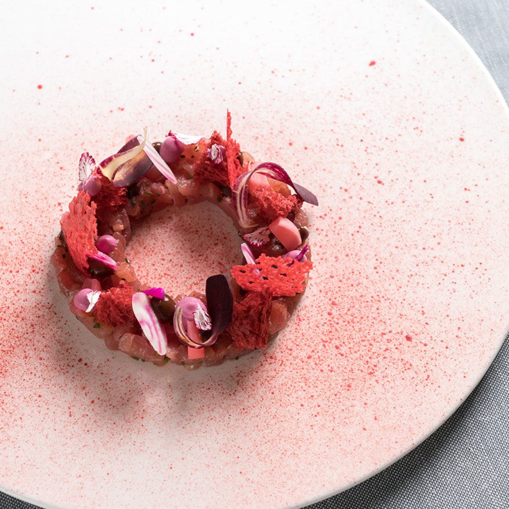 Riso di semola all’amatriciana, seppia alla diavola e aceto balsamico (7 sesterzi), Maiale magalitza, indivia belga, cointreau e bbq (8 sesterzi), Tacos di grano saraceno e alghe, gamberi rosa affumicati, crème fraìche e crauti di cavolo viola all’aceto balsamico (7 sesterzi) e Tonno rosso, barbabietola, dragoncello e radici fermentate (10) sono i piatti del suo menu ispirato al colore rosso.