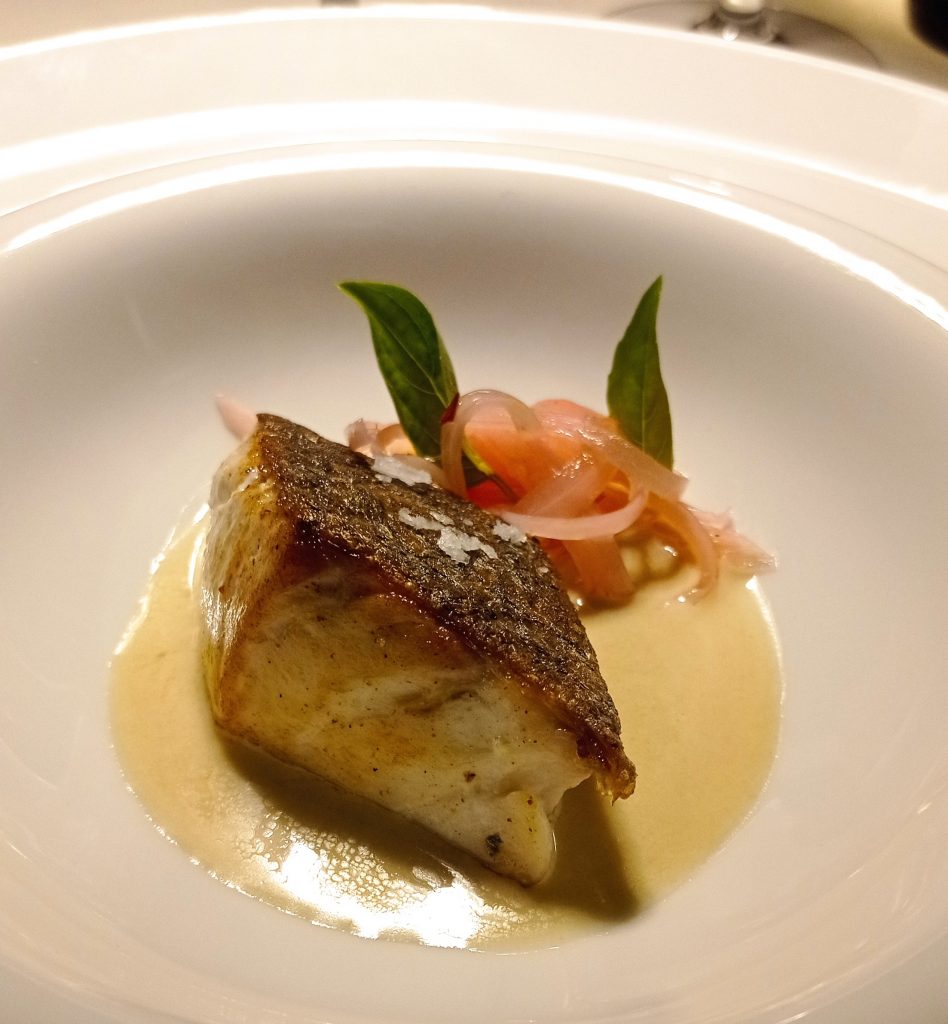 Ottima anche l’ombrina in bagna cauda, qui realizzata con latte di bufala e acciughe. “Si tratta di un pesce con pochissimo grasso, per questo utilizzo un latte che possa favorire la succulenza del morso. La cuocio a bassa temperatura e accompagno con cipolla agrodolce ed agretti”.