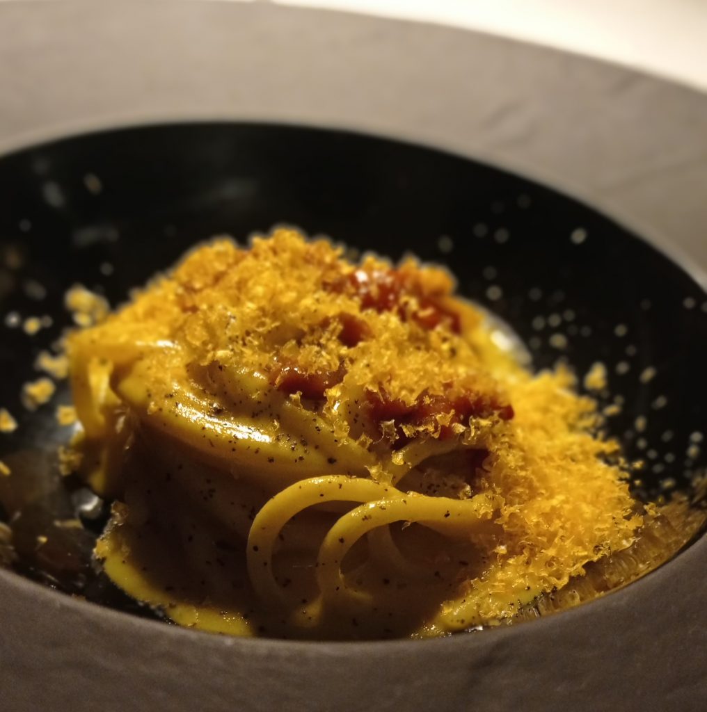 Con il Vascuotto, si entra nel vivo della degustazione. Si tratta di un’antica fresella napoletana, qui in versione liquida, servita con palamita, olive, origano e pomodorini. Sorprendente la Carbonara di mare, completata con ricci di mare e bottarga. La crema d’uovo classica viene sostituita da una purea di datterini gialli emulsionata con acqua di vongole e, per quanto ci riguarda, si aggiudica il titolo di piatto della serata.