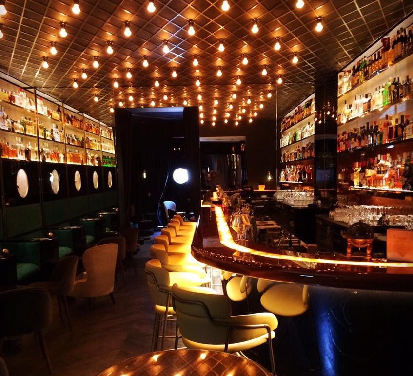 Tre aggettivi che vengono in mente in realtà già da prima di entrare nel locale, sin davanti alla porta d’ingresso, che di fatto è un portone (nel senso massivo del termine) scuro, borchiato, autoritario. C’è un oblò (sul vetro la scritta in oro THE SPIRIT) dal quale poter dare un’occhiata a quello che si troverà dentro. E la prima cosa che si intravede, tra giochi di luci e luci soffuse, tra colori caldi e toni tenui, tra specchi, riflessi ed effetti scintillanti, è uno splendido elegantissimo bancone laccato (sul rosso) con alle spalle una bottiglieria a muro illuminata e da sogno: paradisiaca per ogni amante dei distillati.