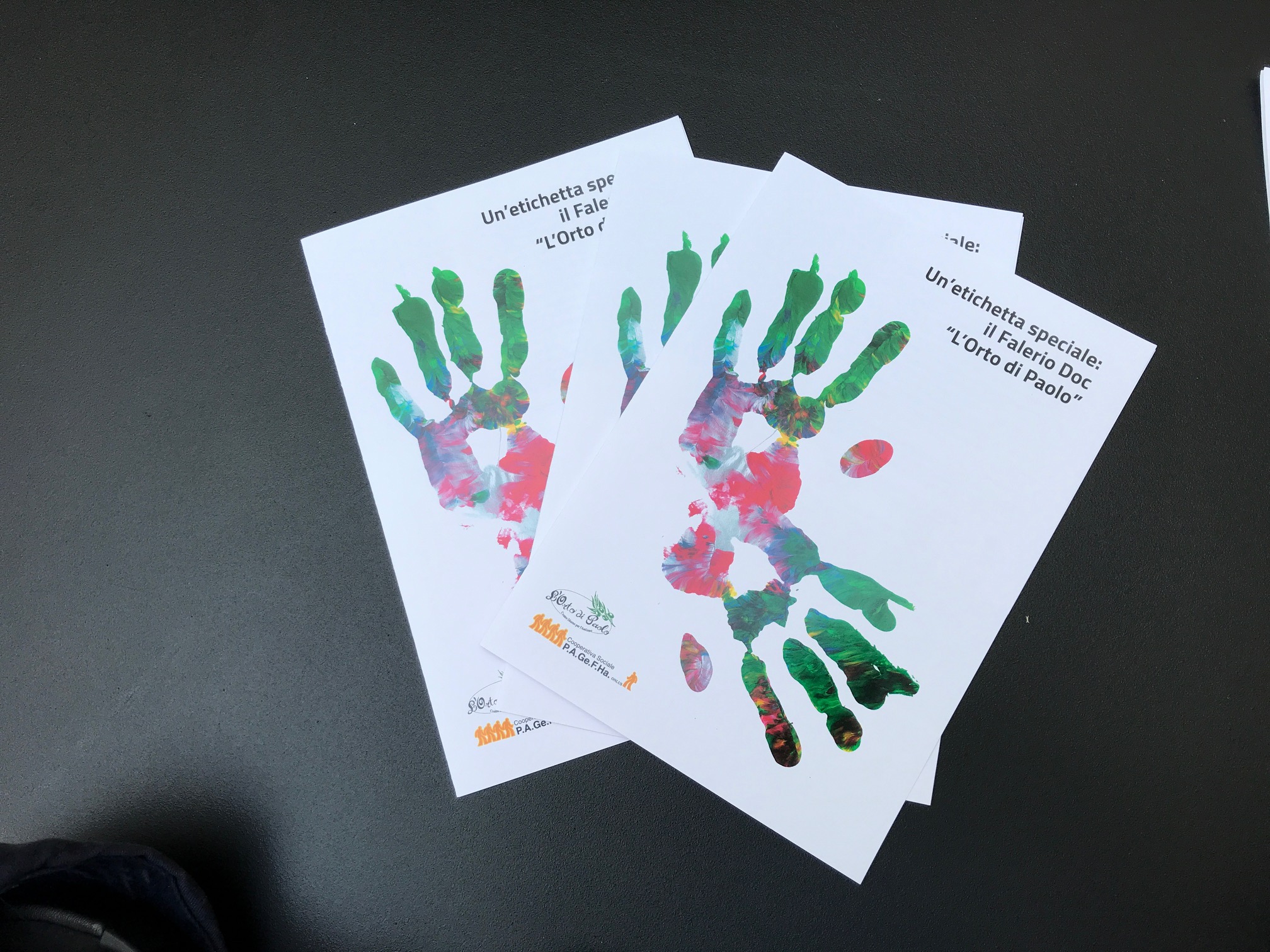 Da questa collaborazione tra l’azienda e i vini Velenesi nasce un’etichetta speciale, il Falerio doc creato appunto da una vendemmia compartecipata dai ragazzi del centro diurno de L’orto di Paolo. Anche L’etichetta stessa è stata disegnata dai ragazzi: la mano è infatti simbolo di un momento di lavoro, di contatto e di condivisione.