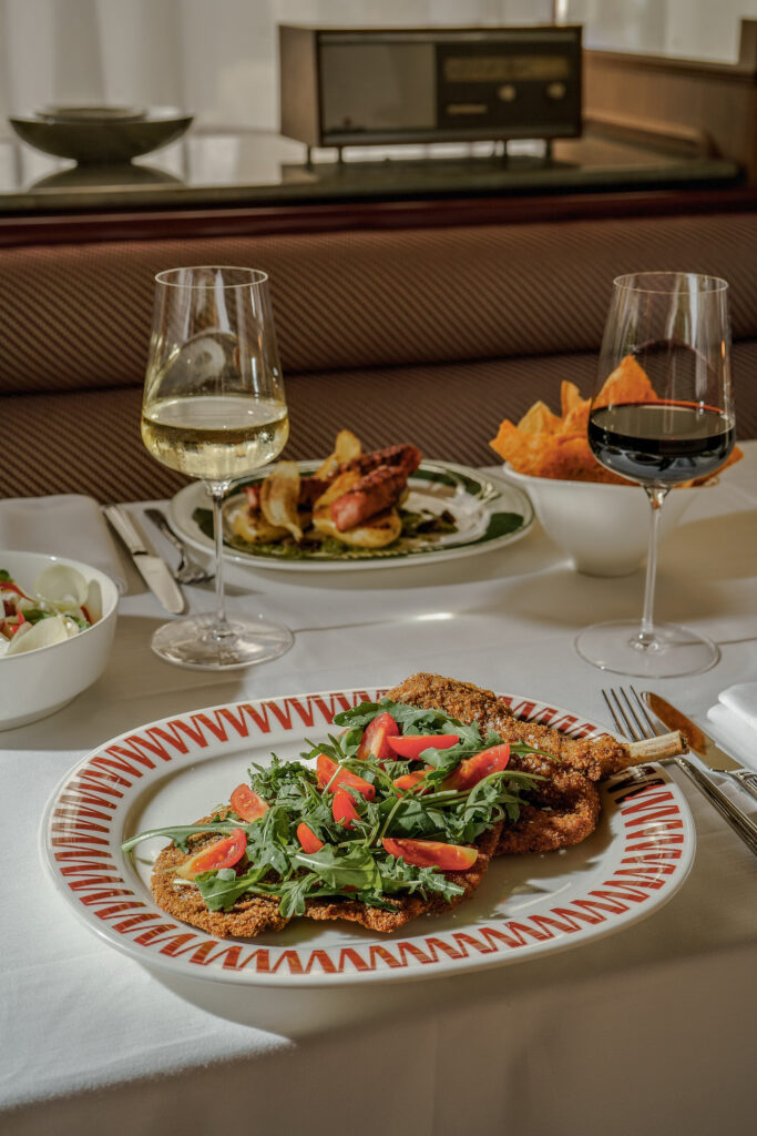 Nel menu spiccano la “Parmigiana di melanzane”, l’“Arancina alla milanese ripiena di ossobuco e gremolada”, gli “Spaghettoni alla Nerano con provolone del Monaco” e i “Pici fatti in casa al ragù”, mantecati direttamente al tavolo, con l’obiettivo di valorizzare la gestualità del servizio. Ne sono un esempio anche la porzionatura del “Gelato al fior di latte”, che viene prodotto artigianalmente tutti i giorni con la Carpigiani, e il taglio del “Salame di cioccolato”, affettato e servito con pan brioche e panna montata. Completa l’offerta, una selezione di piatti da condividere e di pizze croccanti.