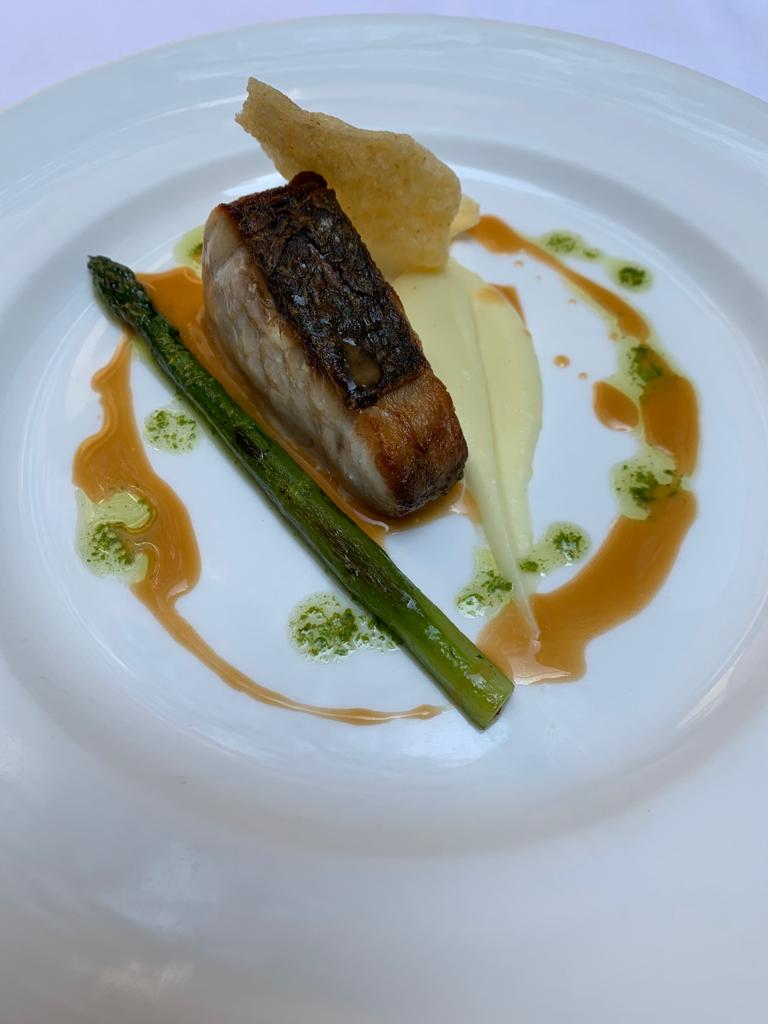 L’intelligente connubio del pesce con i molti vegetali emerge anche dalla proposta “trancio di ombrina con asparagi alla piastra, purea di sedano rapa e riduzioni di crostacei al basilico”: gli ingredienti sono combinati con cura e attenzione in maniera originale e non scontata.