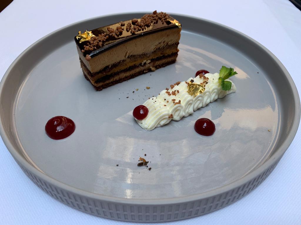 Si eleva per creatività il dolce “Operà alla nocciola e caramello salato con namelaka bianca e gel di amarene” che scoppietta in bocca: il gioco che non ti aspetti. Meraviglia e godimento per le papille.