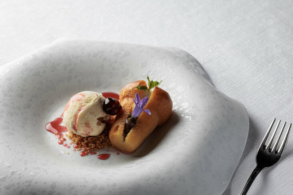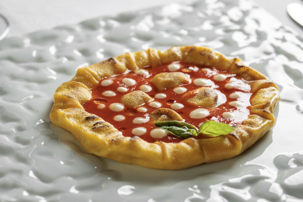 Tra le proposte più emblematiche di Villa Ischia spicca Omaggio a Napoli, un’originale reinterpretazione della pizza napoletana sotto forma di pasta fresca ripiena, che unisce tradizione e novità in un unico piatto. Accanto a questa, i pesci come branzino, ricciola e polpo di scoglio sono trattati con cura mediante tecniche come sottovuoto e cottura sous-vide. E questo è un altro elemento speciale della cucina di Villa Ischia: è inusuale infatti presentare piatti che parlano così insistentemente di mare e di costiera, in una zona di provincia e dell’entroterra. Chef Mattera lo fa, e lo fa bene. È l’inaspettato che sorprende, e fa venire voglia di tornare, ancora e ancora. La proposta include anche piatti ispirati alla memoria, come la pasta patate e provola in versione contemporanea.