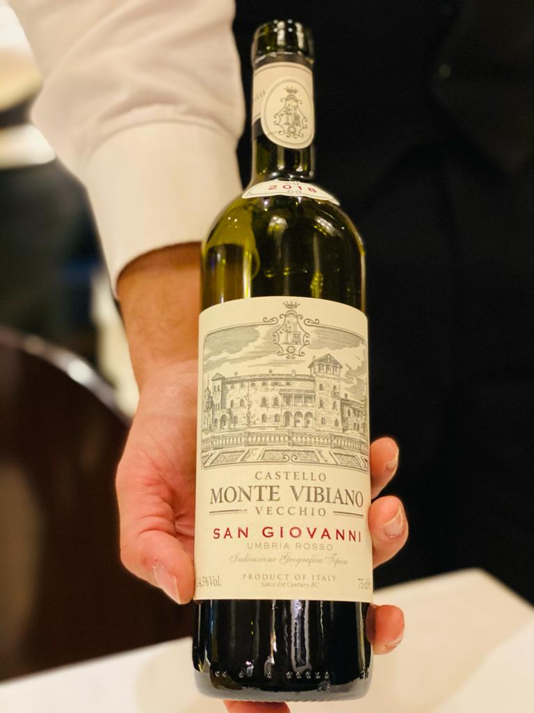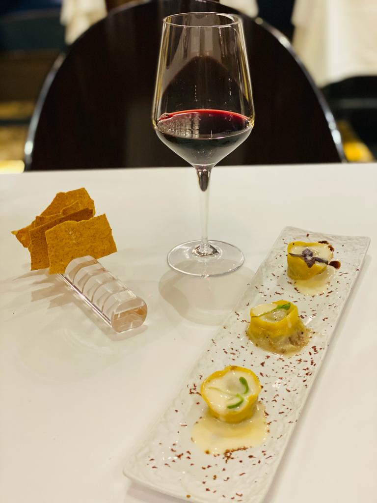 Al risotto è seguito uno straordinario raviolo di coda alla vaccinara con salsa di cacio e pepe e polvere di cioccolato, abbinato a un San Giovanni Umbria Rosso IGT del 2018 di Castello Monte Vibiano, la prima realtà al mondo ad aver ricevuto la certificazione di “0 emissioni CO2” in tutta la zona in cui coltiva olio extravergine di oliva e vino da vitigni con minimo 25 anni di età. Si tratta di un vino composto da San Giovese che riposa per 15 mesi in acciaio purissimo e, contestualmente, Merlot e Cabernet Franc, lasciati riposare per 15 mesi in piccolissime barrique di Rovere Francese. L’eleganza e la pulizia del vino riescono a contrastare perfettamente la tendenza un po’ grassa e succulenta della coda e della fonduta di cacio. Allo stesso tempo però, la speziatura data dal pepe la ritroviamo anche all’interno del calice. Un binomio dunque, per contrasto ma anche per assonanza.