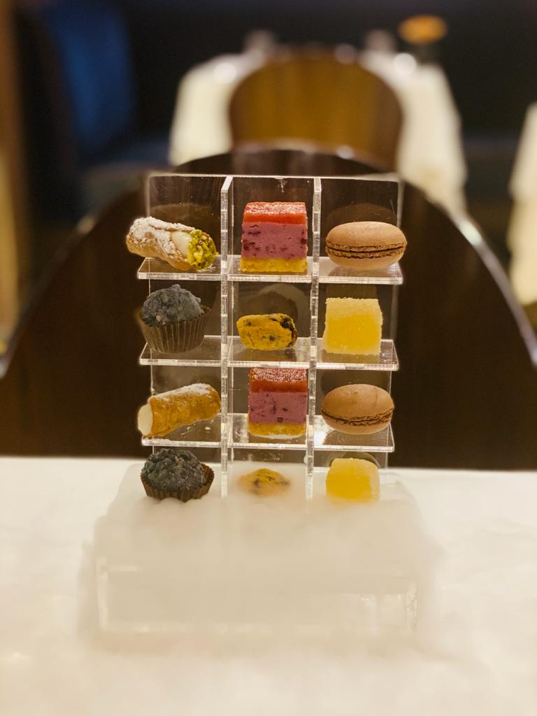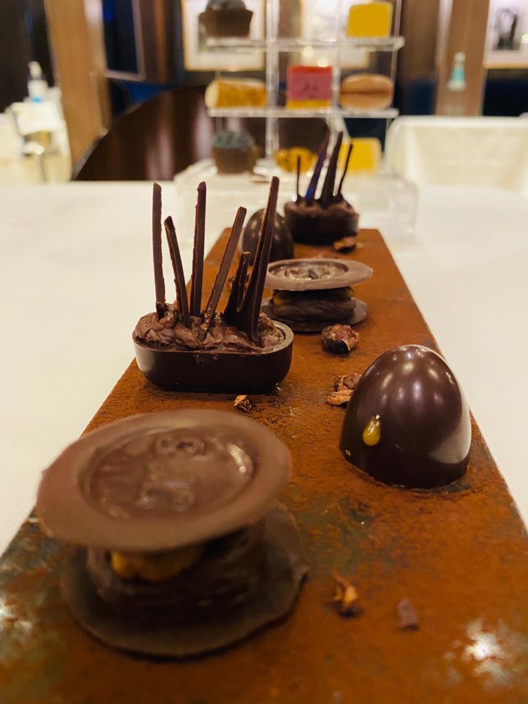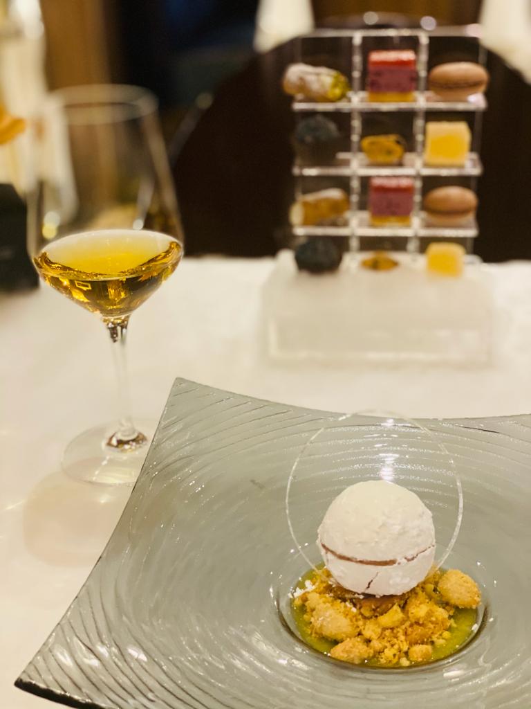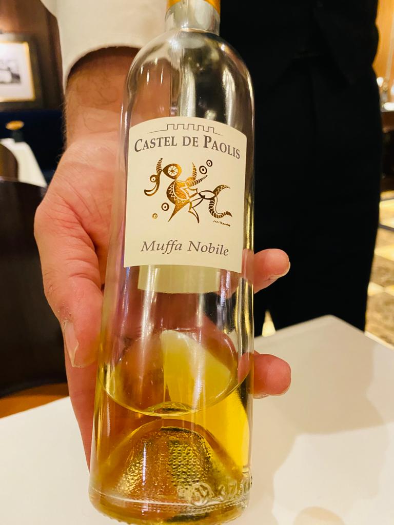 Dulcis in fundo il pianeta di meringa con crema di marroni piemontesi su terriccio al mandarino abbinato al Muffa Nobile Lazio IGT 2016 di Castel De Paolis. Questo vino, composto da 70% di Semillon, 20 % di Sauvignon Blanc e 10% di Moscato Bianco, viene lasciato riposare un anno in piccole barrique di rovere francese e poi imbottigliato. Il suo sentore di vaniglia, albicocca, miele e frutta secca si accosta perfettamente al dolce.
