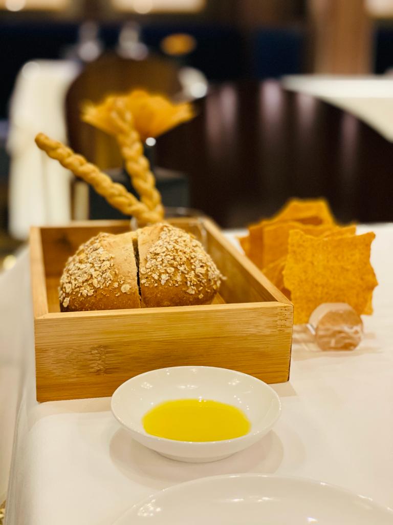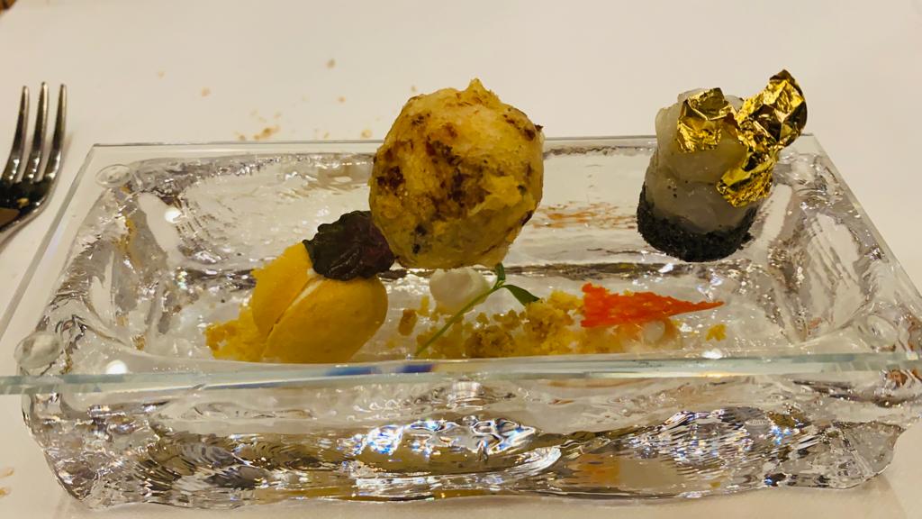 La serata è iniziata con un prelibato cestino di cracker alla crusca, panino con avena e taralli accompagnati da un profumato olio extravergine di oliva, seguito con una tartare di seppia con foglia d’oro, coccola di baccalà e peperoni cruschi e tarlelletta al formaggio.