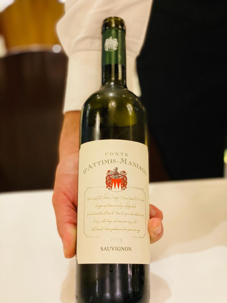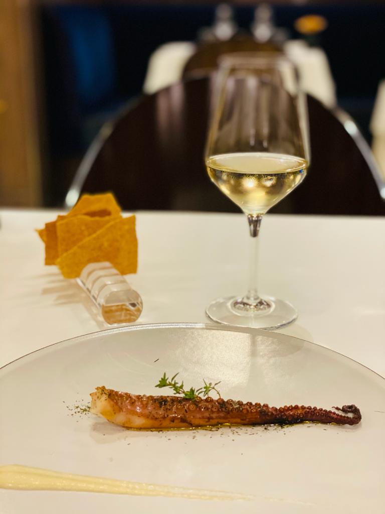 Prima portata della serata è stata un polpo mediterraneo cotto in acqua di mare e accompagnato da una crema di topinambur al sentore di timo limonato. A questo è stato abbinato un Sauvignon Friuli Colli Orientali 2019, un vino in purezza che deriva da cloni italiani e francesi, coltivati dal 1800. La particolarità di questo vino ha un risvolto quasi romantico. Tutte le bottiglie vengono fatte riposare all’interno di una cantina del ‘500 all’interno di un castello. Il suo sentore di frutta fresca e fiori bianchi ben si sposa con la tendenza dolce e grassa del polpo e con il sentore agrumato del timo limonato.