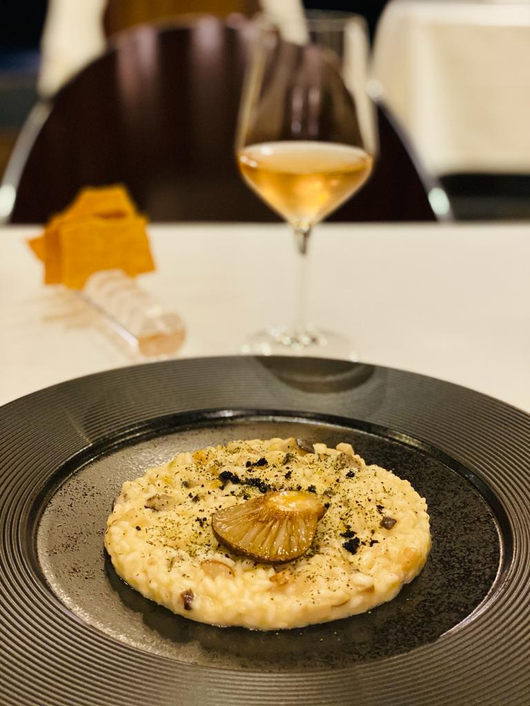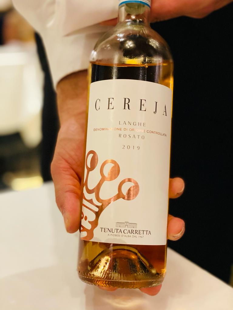 A seguire, è stato servito un risotto Carnaroli con brodo di faraona e funghi cardoncelli con polvere di aglio nero. Al piatto è stato abbinato un rosato: Cereja Langhe 2019 di Tenuta Carretta. Si tratta di un vino dal colore accattivante che ricorda i rosati provenzali, con una spiccata mineralità che ben si amalgama al perfetto bilanciamento tra riso Carnaroli, brodo di faraona e aglio nero.
