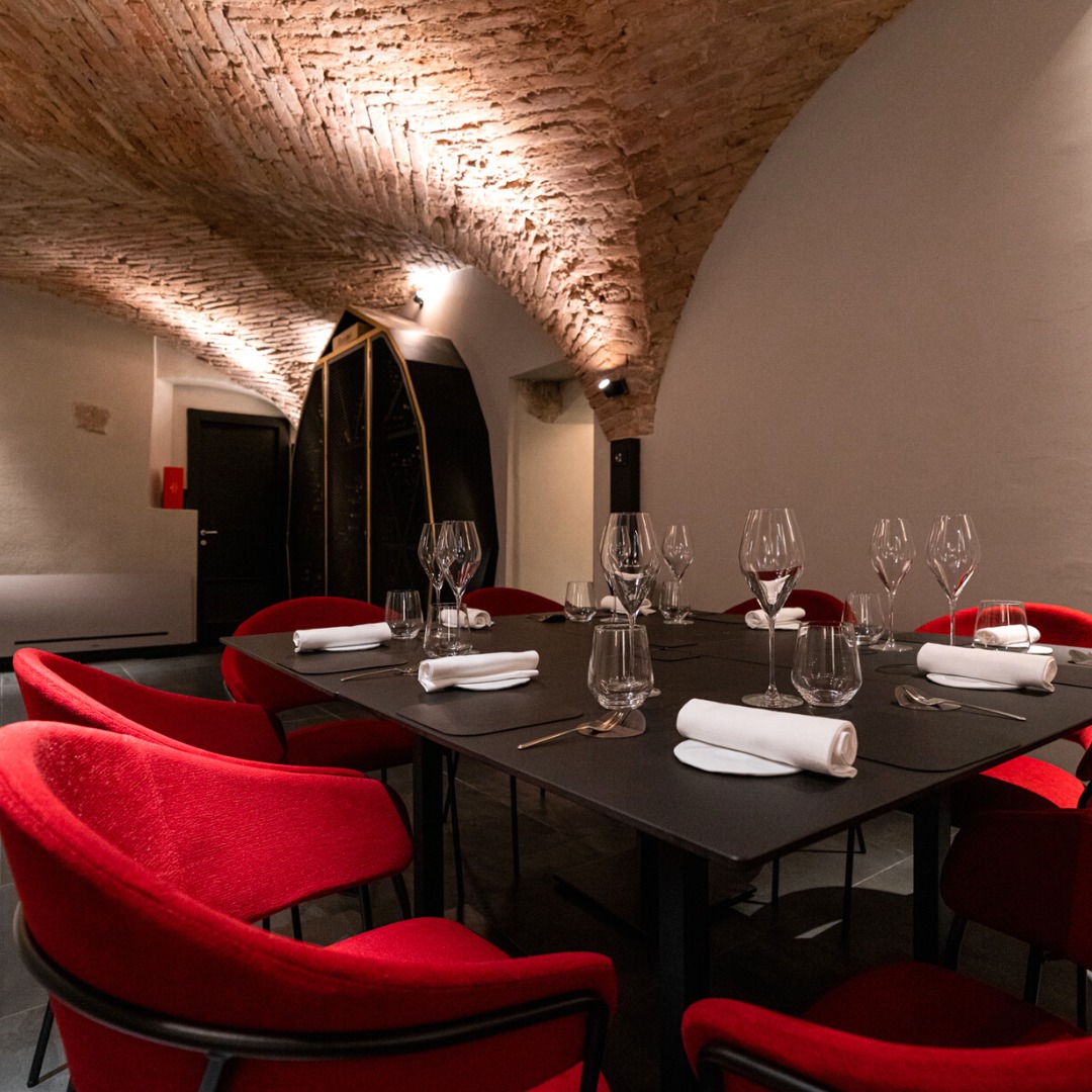 Scendendo le scale ci si trova poi nella seconda sala, al piano interrato: più intima e caratterizzata da ampie volte di mattoni a vista e luci soffuse.