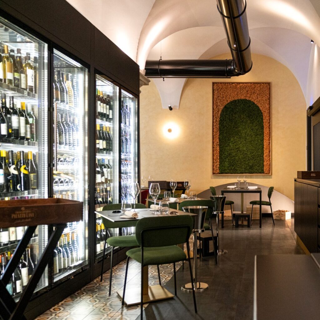 Alle spalle del bar ecco l’avveneristico “Teatro del vino”, con le sue celle a temperatura controllata e una sconfinata collezione di vini di pregio. Qui verrete accolti per un calice prima di cena, avvolti da musica di sottofondo e circondati da installazioni vegetali, che impreziosiscono le pareti e i soffitti.