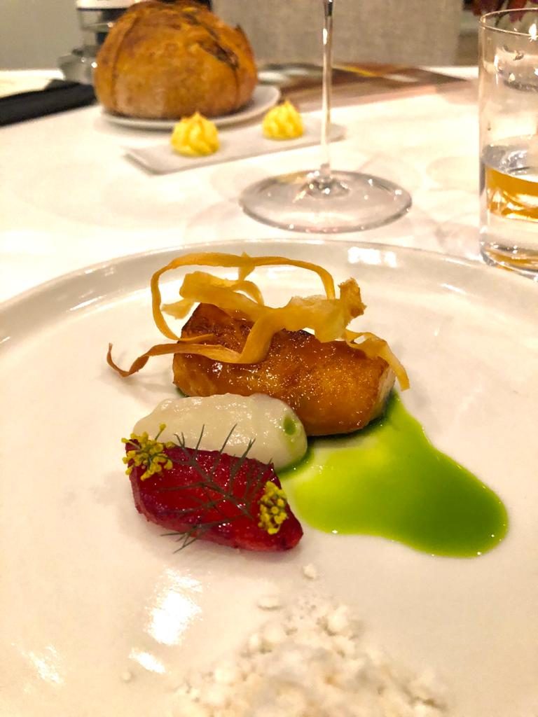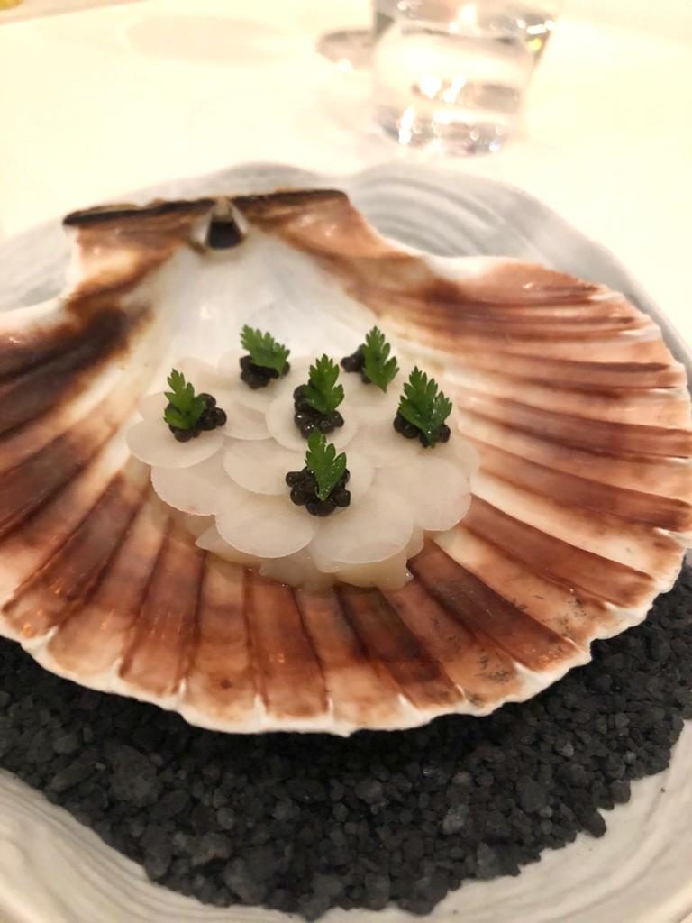Troviamo poi uno dei piatti più teatrali della degustazione, “Crudo di capesante Orkney, Anatra stagionata, Caviale Imperial, soia Dashi e Malabar,” una texture ricca di sapidità e freschezza che risalta la dolcezza del crudo, senza travolgere il palato.